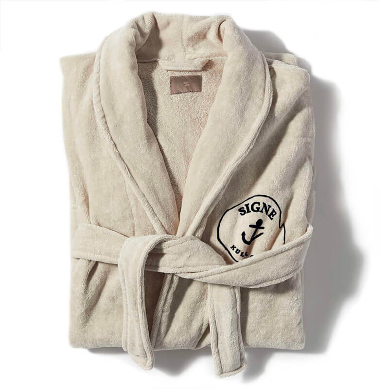 Vi har letat i evigheter efter en leverantör av badrockar. Detta är samma badrock som Lena använt dagligen (och då menar vi dagligen, även morgondopp vintertid, i 5 års tid). Det fina är att den håller kvalitén, och formen. Vi är därför glada att äntligen kunna erbjuda dessa lyxiga badrockar hos oss. Vi broderar båtens – eller ditt – namn på vänster bröst. Badrocken har ledig passform och två generösa framfickor. 500 g/m² av den mjukaste ekologiska långfibriga bomullen, vävd med något kortare tvist för att kompensera för bomullens tjocklek. Avslutad med tygkantad utsida. En bad- eller morgonrock som alltså blir bättre med tiden. En användare beskrev den: ”som att kliva in i en varm kram efter badet”. 100% ekologisk extra tjock bomull, Oeko‑Tex100-certifierad. Modellen är unisex och finns i 2 storlekar: S/M eller L/XL. (Frottéhanddukarna är i samma serie, om du vill ha i samma färg.)
